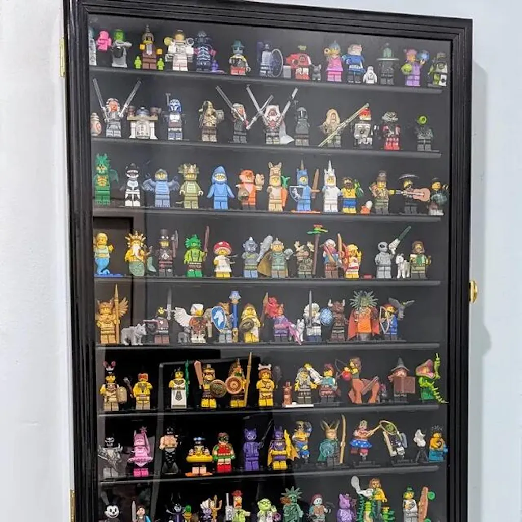 This minifigures display case features 8 rows to fit 110+ minifigures. This cabinet has extra height to fully display larger figurines or small figurines holding tall items. Each shelf has an over lip to keep your items from falling. Protected by our ultra-clear specially coated plexiglass. Brass hinges and lockable brass latches with 2 sets of keys. Case comes fully assembled. Heavy duty wall mounting kit included. Mounting hardware shipped in the same package.