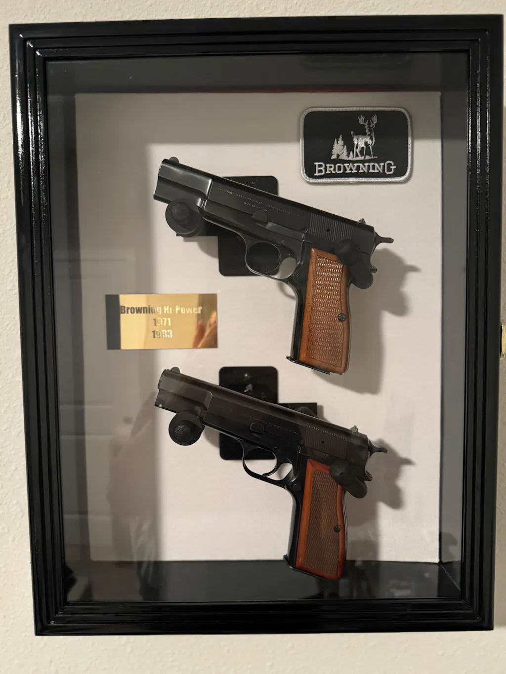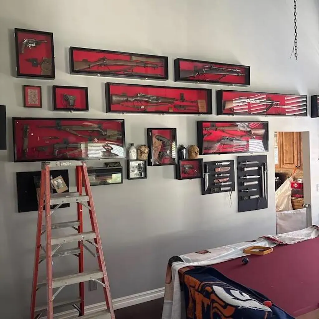 This gun display case accommodates 1 large pistol or up to 2 pistols. Protected by our ultra-clear, specially-coated, UV-protection acrylic. The felt background adds a visual contrast for your rifles. 1 gun mounting kit (composed of 2 sturdy padded metal hooks) is included in your package and installed at your discretion to create the best fit**. Case comes fully assembled. Mounting hardware is shipped in the same package.